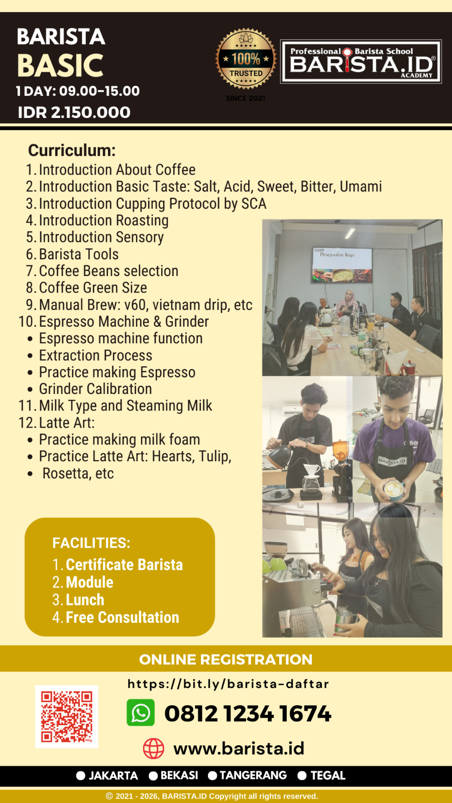 Barista BASIC BARISTA BASIC ( 1 Day ) Durasi Pelatihan: 1 hari (@6 jam / hari : 09.00 – 15.00) Jadwal Kelas Baru BARISTA BASIC dibuka setiap hari Jumat atau Sabtu. Hubungi Customer Service: Scan Barcode Pendaftaran BARISTA.ID Academy