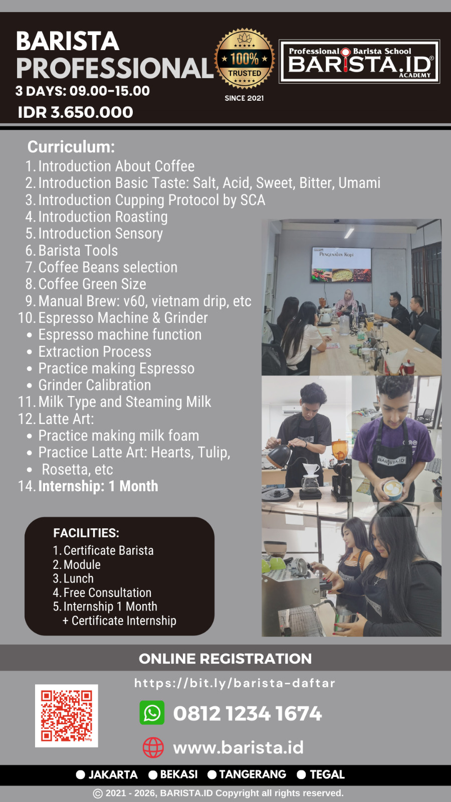 Barista Professional Durasi Pelatihan: 3 hari (@6 jam / hari : 10.00 – 16.00)Hubungi Customer Service:Scan Barcode Pendaftaran BARISTA.ID Academy