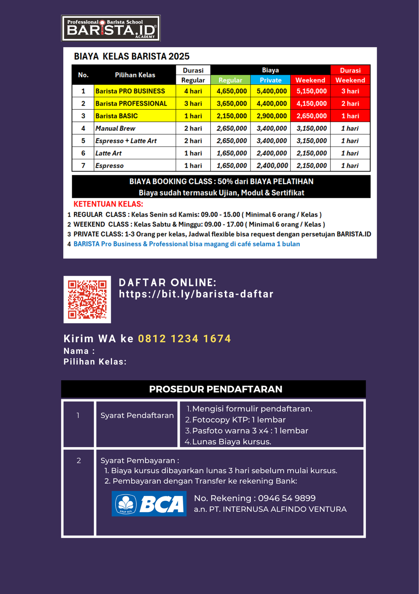 Biaya Pilihan Kelas dan Biaya https://bit.ly/barista-daftar Scan Barcode Pendaftaran BARISTA.ID Academy